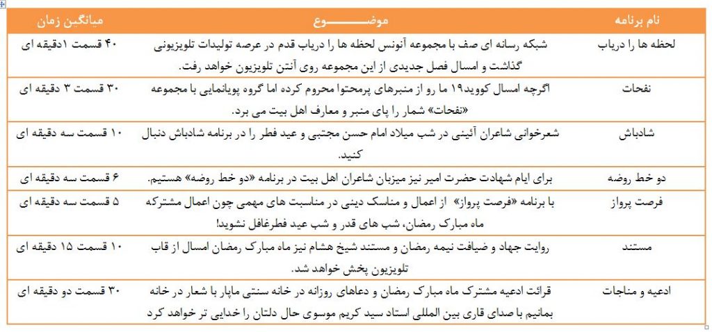 وی با بیان اینکه محصولهای تولید رسانه، از شبکههای مختلف سیما همچون شبکه ۳، مستند، قرآن و خوزستان اکران خواهد شد، گفت: «لحظهها را دریاب»، «نفحات»، «شادباش»، «دو خط روضه»، «فرصت پرواز»، «مستند» و «ادعیه و مناجات» بخشی از تولیداتی هستند که بهصورت مجموعهای از شبکههای سیما در ماه مبارک رمضان الکریم پخش خواهند شد.
